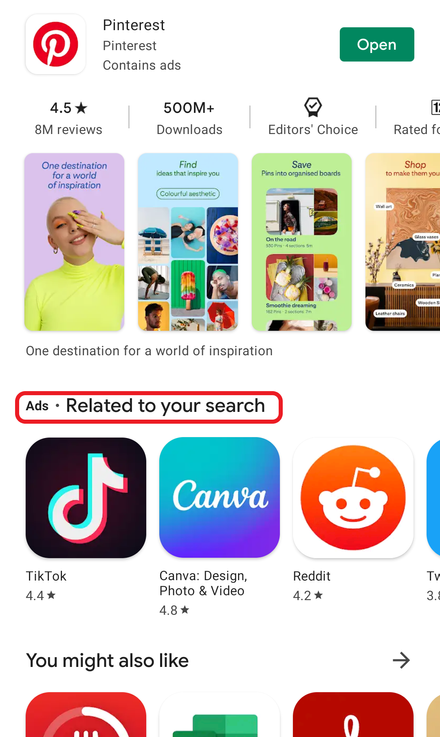 App campaigns promote your app in the app store or the Google Search results page. This is not to be confused with image or video ads that appear in apps (these would be set up with a display campaign). When someone searches on Google for an app, your ad can appear in the search results and users will be directed to the app store to download the app. Ads in the app store appear either in the recommendation tab or when you search for an app that is similar to yours. You can use app campaigns to promote both iOS and Android apps.